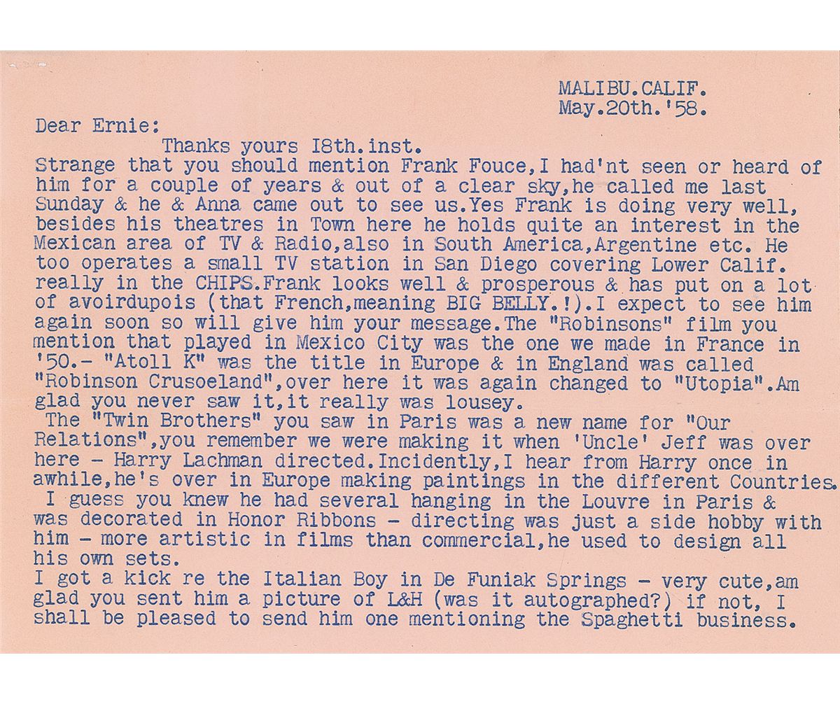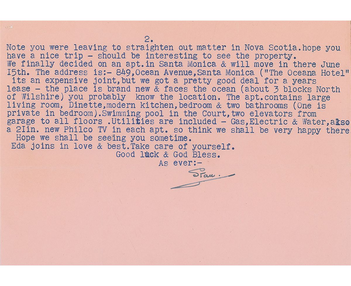 TLS signed “Stan,” two pages, 8.25 x 6, May 20, 1958. Letter to Ernie. In part: “The ‘Robinsons’ film you mention that played in Mexico City was the one we made in France in ’50.’—‘Atoll K’ was the title in Europe & in England was called ‘Robinson Crusoeland,’ over here it was again changed to ‘Utopia.’ Am glad you never saw it, it was really lousy…We finally decided on an apt. in Santa Monica & will move there June 15th…‘The Oceana Hotel.’” In fine condition, with intersecting folds, and a staple hole to top left corners.