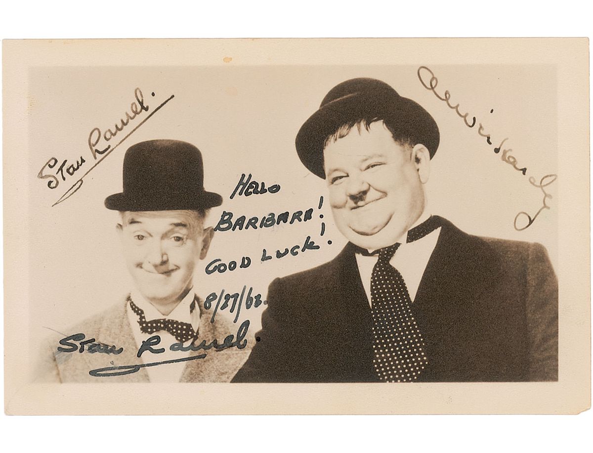 Matte-finish 5.5 x 3.5 photo of Laurel with his comedic co-star, signed and inscribed in fountain pen, “Hello Barbara! Good luck! 8/27/62, Stan Laurel.” Also bears facsimile signatures of both actors inherent to the image. In fine condition, with slight brushing to his first name.