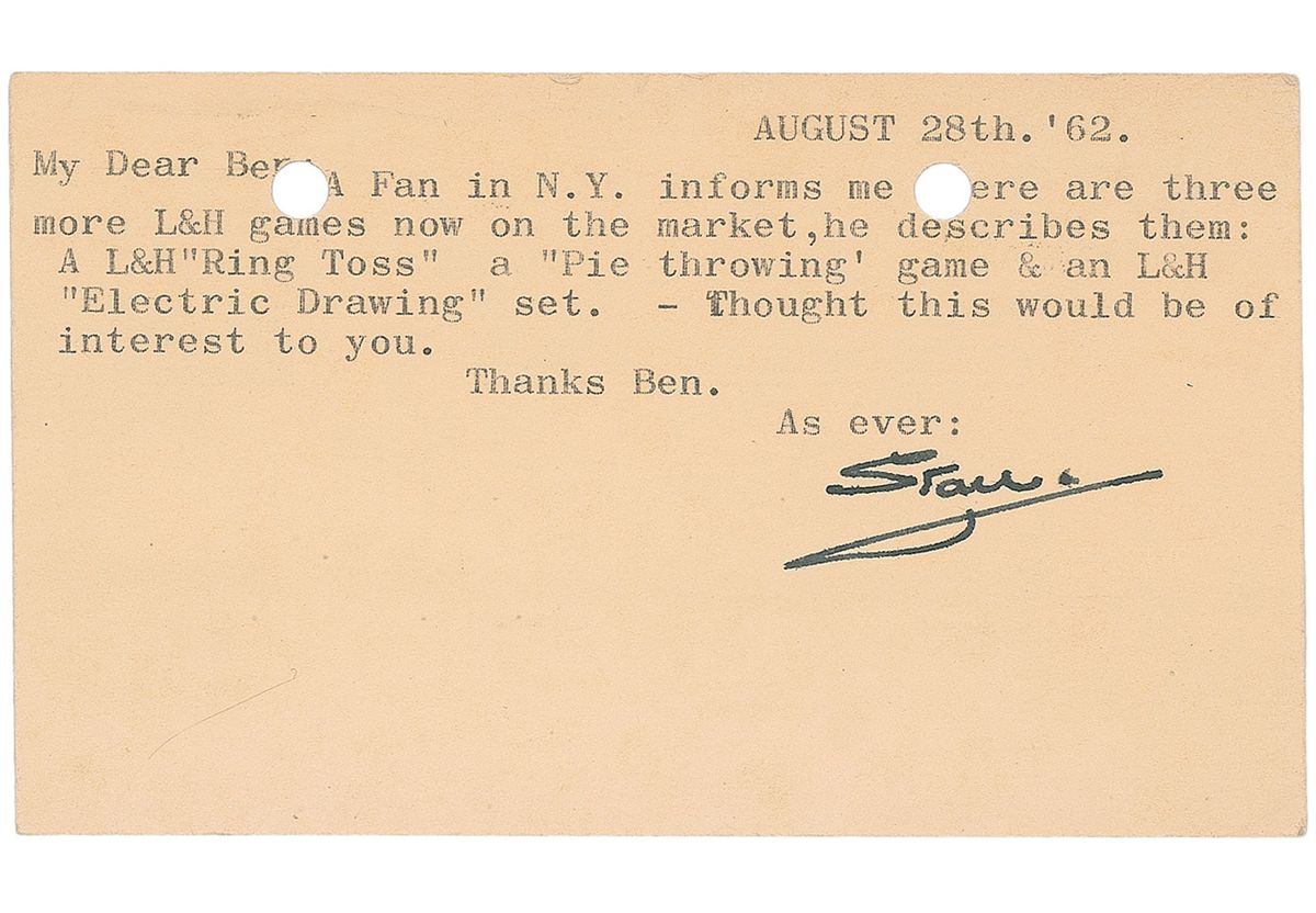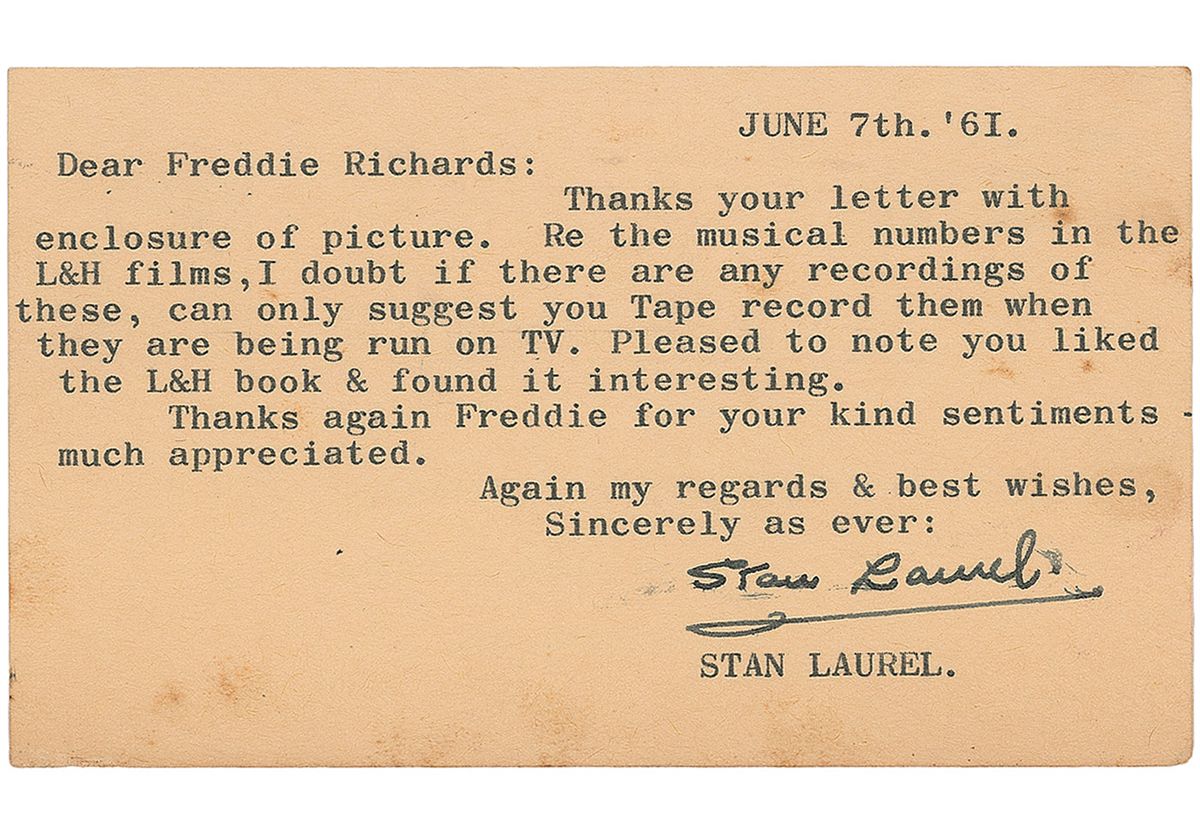 Two TLSs, one signed, “Stan,” and the other signed, “Stan Laurel,” on individual 5.5 x 3.25 postcards, dated 1961 and 1962. One letter to Freddie Richards, reads in part: “Re the musical numbers in the L&H films, I doubt if there are any recordings of these, can only suggest you tape record them when they are run on TV. Pleased to note you liked the L&H book & found it interesting.” The other letter lists three new Laurel and Hardy games available on the market. In fine condition, with scattered soiling to one letter and two punch holes to top edge of the other.