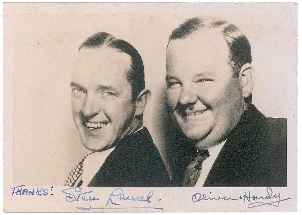Uncommon vintage matte-finish 7 x 5 photo of Laurel and Hardy smiling without their trademark bowler hats, signed in the lower border in fountain pen, “Thanks! Stan Laurel.” Photo also bears a secretarial signature of Oliver Hardy. In very good condition, with creasing along upper portion and trivial foxing to bottom edge.