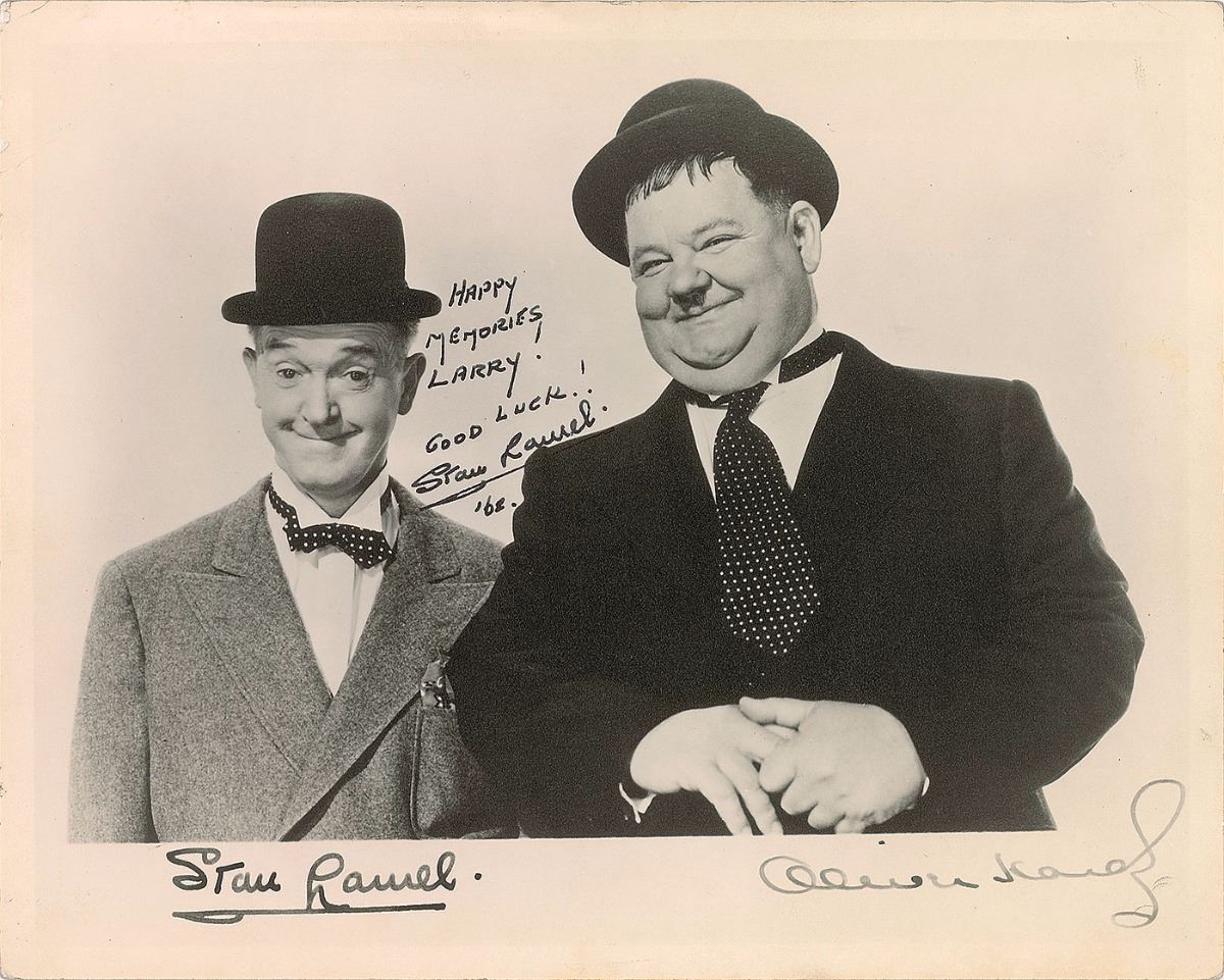 Vintage matte-finish 10 x 8 photo of Laurel and Hardy posing together, signed and inscribed in fountain pen, “Happy memories Larry! Good Luck! Stan Laurel ’62.” Lower border of photo bears pre-printed signatures of both Laurel and Hardy. In fine condition.