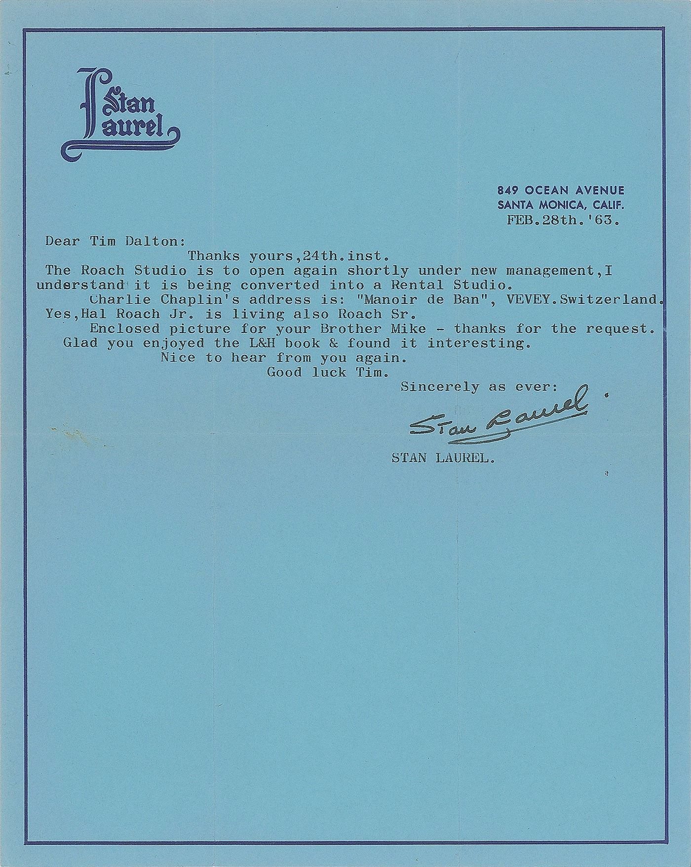 TLS, one page, 8 x 10, personal letterhead, February 28, 1963. Letter to Tim Dalton, in part: "The Roach Studio is to open again shortly under new management, I understand it is being converted into a Rental Studio. Charlie Chaplin's address is: 'Manoir de Ban,' Vevey, Switzerland. Yes, Hal Roach Jr. is living also Roach Sr." In fine condition. Accompanied by the original mailing envelope.