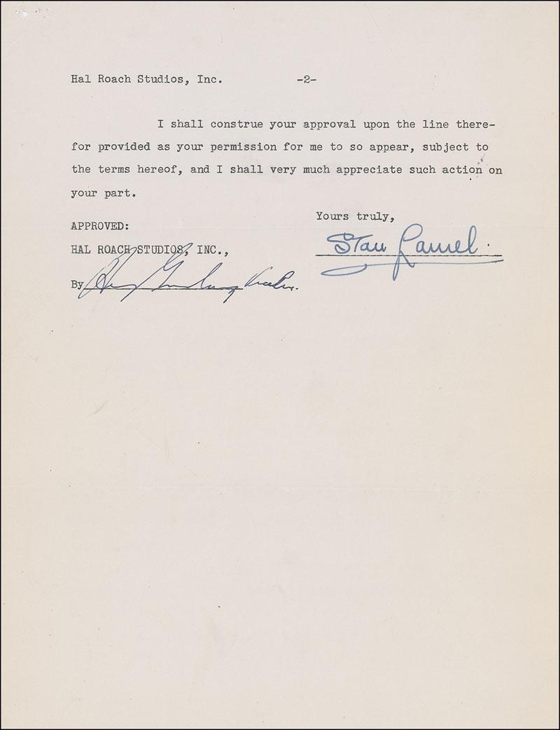 Signed at the conclusion by Laurel, and countersigned by studio vice president Henry Ginsberg. In fine condition, with staple holes to top left corners.