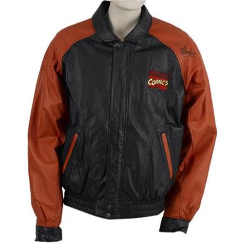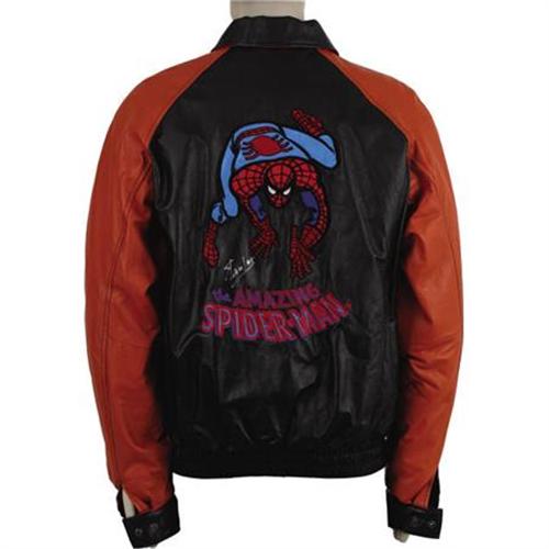 <B>Stan Lee Autographed Amazing Spider-Man Leather Varsity Jacket (Jump Inc.).</B></I> Black leather varsity jacket with red leather sleeves and trim. Fabric and embroidered Spider-Man on back with <B>Amazing Spider-Man </B></I>logo. Marvel Comics logo embroidered on front left chest. Size "big." Signed twice by Stan Lee. Once on the front left sleeve, in black, and once on the back, in silver ink, under Spidey. New condition.<BR><BR><b>Shipping:</b> Clothing, Costumes & Jerseys (<a target="_blank" href="http://www.heritageauctions.com/common/shipping.php">view shipping information</a>)