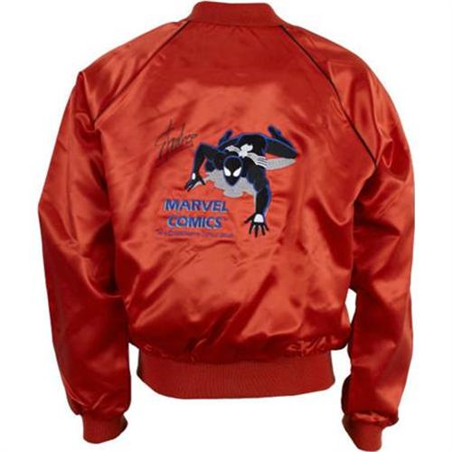 <B>Stan Lee Autographed Satin Spider-Man Baseball Jacket (High 5 Sports Wear, 1986).</B></I> Red satin baseball jacket with Spider-Man in the black symbiotic suit embroidered on back, with Marvel Comics logo. Large size. Signed by Stan Lee on back, in black, to the left of Spidey. Excellent condition. Lightly soiled with a small 1.5" run on the left front shoulder. <BR><BR><b>Shipping:</b> Clothing, Costumes & Jerseys (<a target="_blank" href="http://www.heritageauctions.com/common/shipping.php">view shipping information</a>)