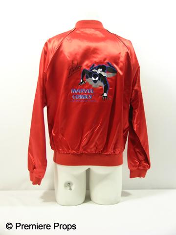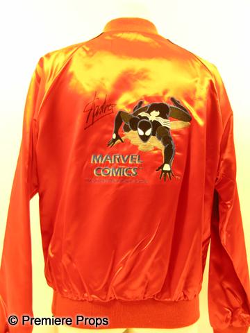 Stan Lee Autographed Spider-Man Jacket - From the personal collection of Stan Lee, this is his worn Spider-Man jacket. A red satin baseball style jacket, size large, with Spidey in his black costume. Also includes a Japanese one sheet rolled poster from the first Spider-Man film signed by Stan Lee (29" x 40"), and a paper mask of Stan Lee from "The Stan Lee Documentary: True Believer". Includes documentation.