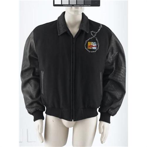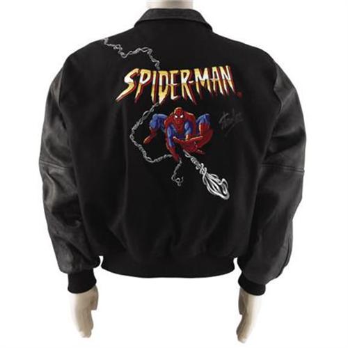 <B>Stan Lee Autographed Spider-Man Varsity Jacket (Marvel).</B></I> Black varsity jacket with leather sleeves and trim. Embroidered Spider-Man on back, shooting a web over the shoulder to form a ring around the Marvel Films logo on the front left chest. Extra large size. Signed twice by Stan Lee, in silver ink, once on the upper left sleeve and once on the back, to the right of Spidey. Excellent condition. Lightly soiled.<BR><BR><b>Shipping:</b> Clothing, Costumes & Jerseys (<a target="_blank" href="http://www.heritageauctions.com/common/shipping.php">view shipping information</a>)