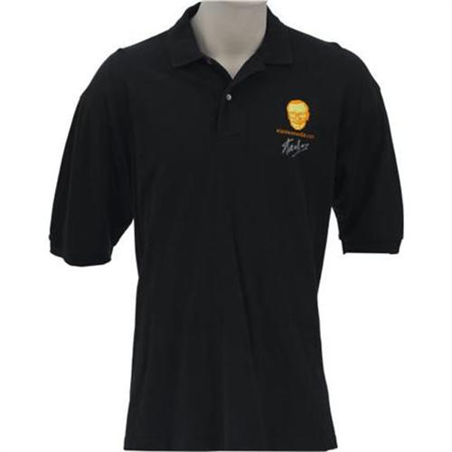 <B>Stan Lee Autographed Stanleemedia.com Golf Shirt (Outer Banks).</B></I> Black golf shirt with Stan "the Man" Lee's likeness, in yellow and orange, on the front left chest. "stanleemedia.com" is embroidered, in orange, underneath. Size large. Stan Lee has signed, in silver ink, under "stanleemedia.com." New condition.<BR><BR><b>Shipping:</b> Clothing, Costumes & Jerseys (<a target="_blank" href="http://www.heritageauctions.com/common/shipping.php">view shipping information</a>)