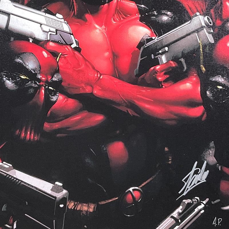 A piece of comic book history, this limited edition, from original art by Clayton Crain, depicts a multitude of Deadpools. Clayton Crain is an American comic book artist, who primarily uses digital painting techniques in his art. He is best known for his works on Ghost Rider: Road to Damnation, Venom vs. Carnage and Sensational Spider-Man (vol. 2). Crain's current work is X-Force for which he does both the covers and interior art. "Deadpool #2" is a limited edition giclee on canvas by Clayton Crain presented by Marvel Comics and hand signed by Stan Lee (1922-2018). This piece comes framed. Includes Certificate of Authenticity. Measures approx. 25.5" x 34.5" (frame); 17.5" x 26.5" (image).