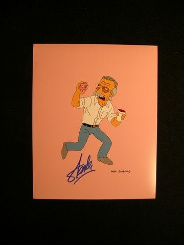 A glossy, color photo of Marvel Comics legend Stan Lee. The photo is of Mr. Lee as he was depicted in a 'Simpsons' episode and has been signed in blue felt pen. Photo was signed at an after party for the premiere of 'The Avengers.' A difficult autograph to obtain as Mr. Lee gets older. (measures approx. 8"x 10")