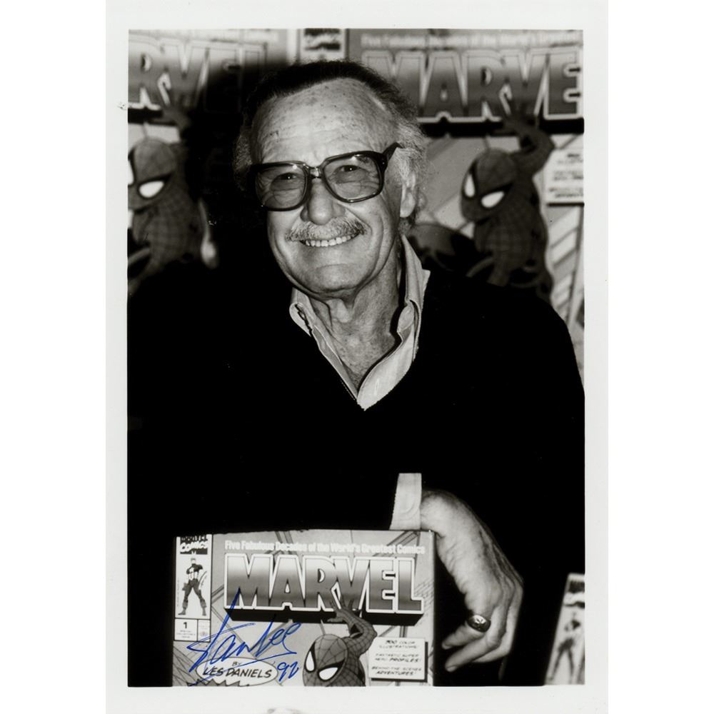 Glossy 5 x 7 photo of the Marvel Comics boss posing with a Spider-Man comic book, signed in blue ink, "Stan Lee, 92." In fine condition, with some light surface stains.