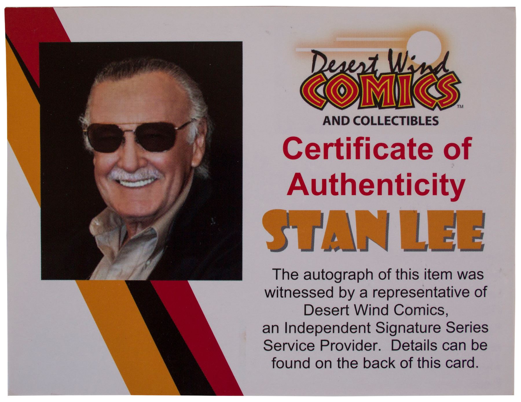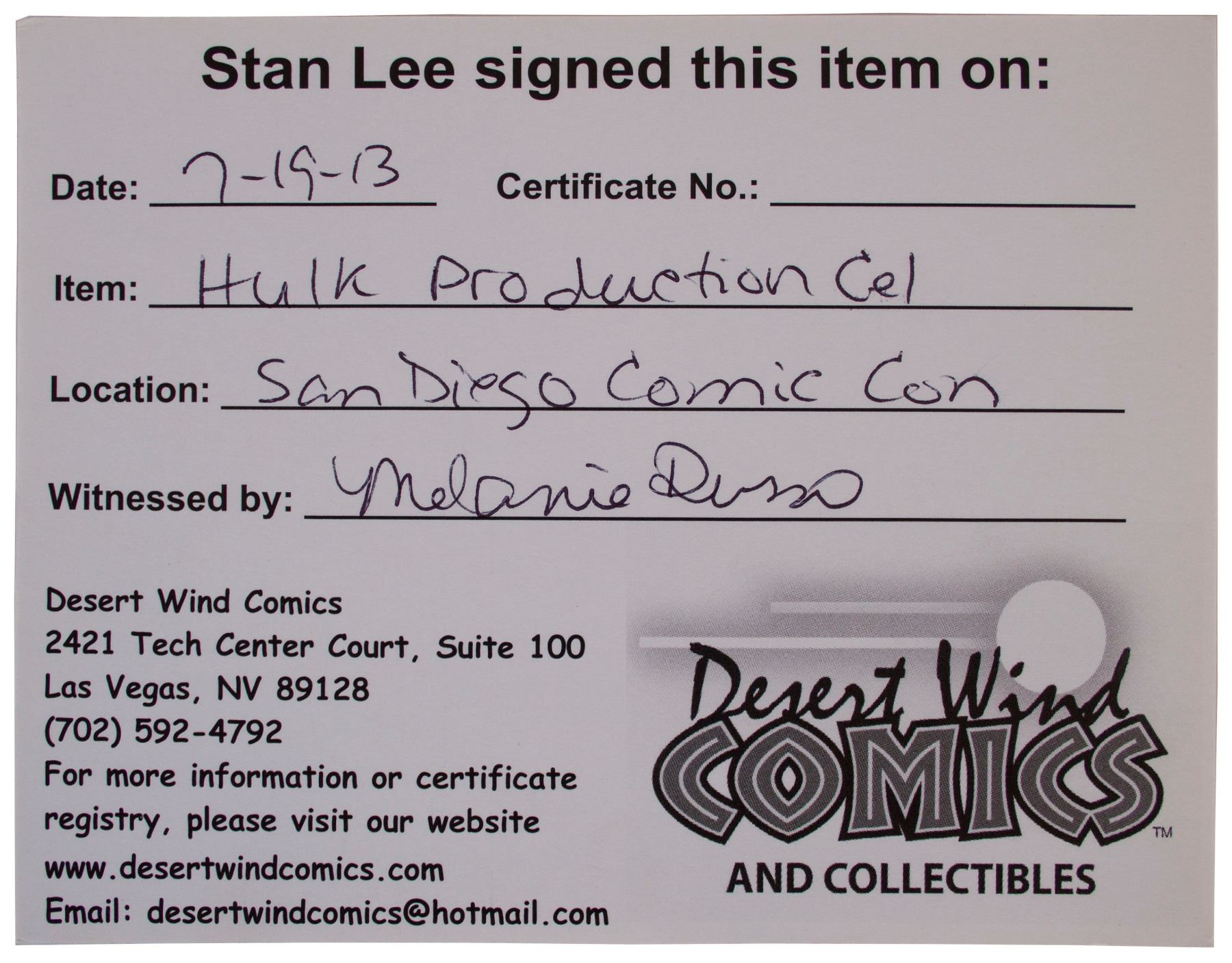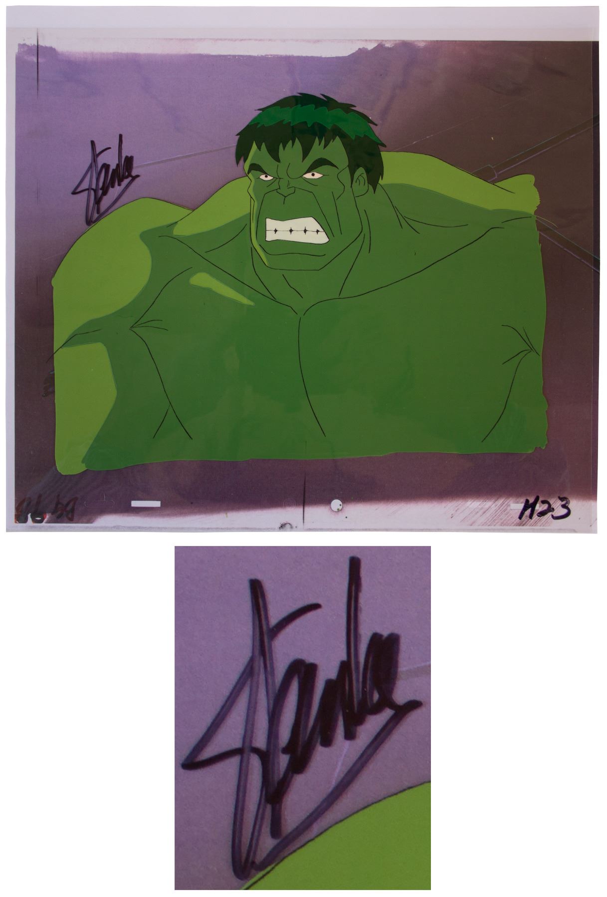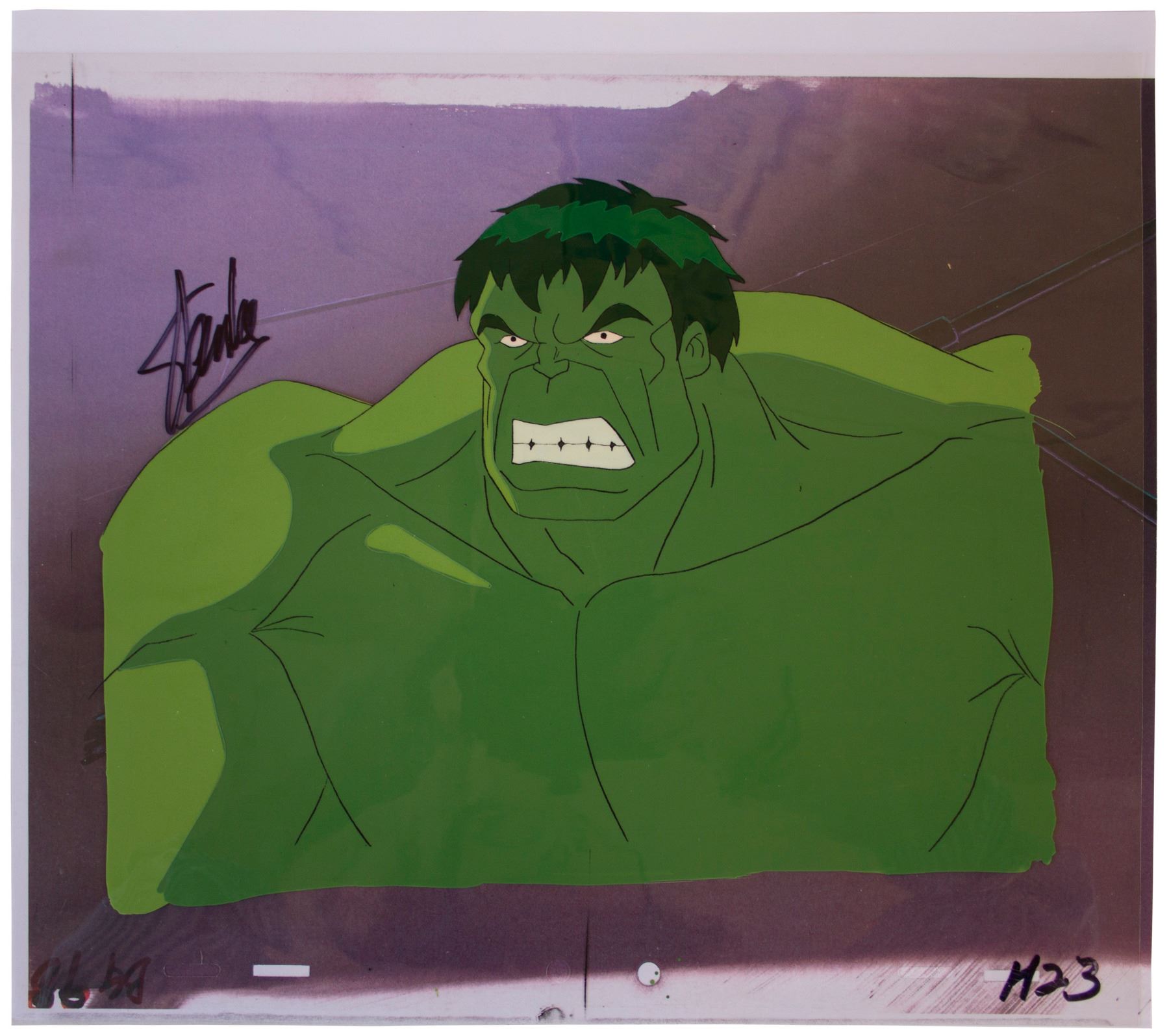 Legendary cartoonist, Stan Lee signed production cel of his creation, ''The Incredible Hulk'', from the television series that ran from 1996-97. The Hulk is shown here baring his teeth, green with fury. Hand-painted cel measures 12.5'' x 10.5'', accompanied by a purple background for framing. Near fine condition.