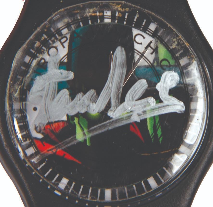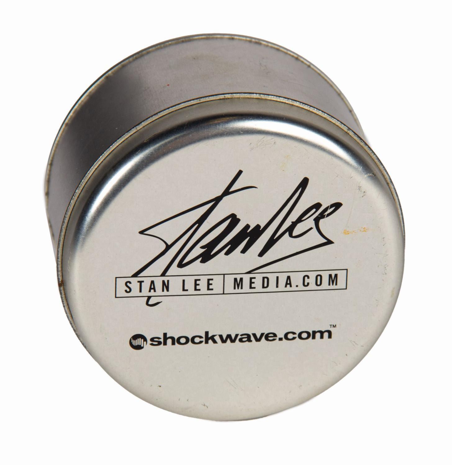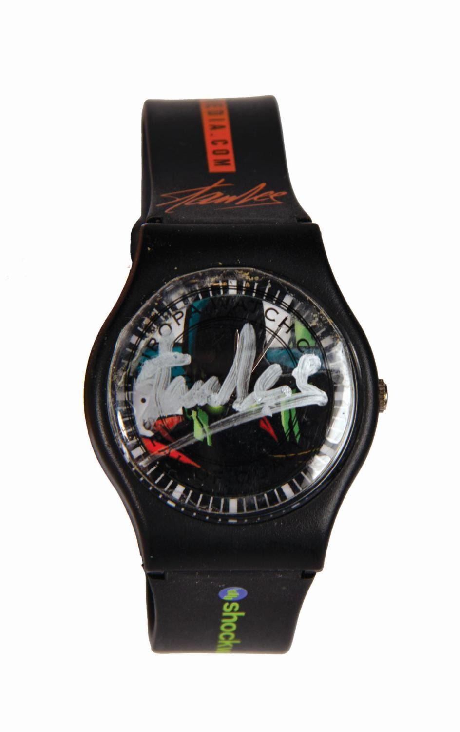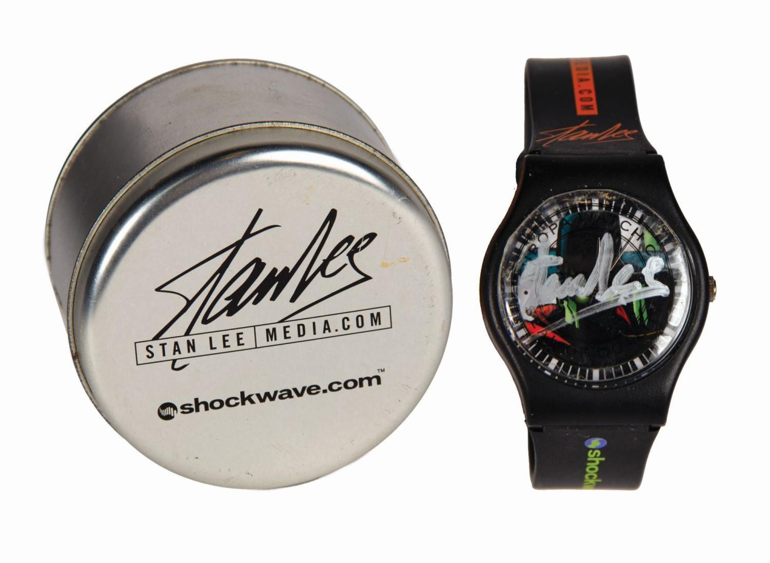 (Shockwave, 2000) A Europa Japanese movement wristwatch branded with the Macromedia Shockwave and Stan Lee Media logos. Made as a promotional item for the first Stan Lee created Shockwave web series, the 7th Portal, the face of the watch features an image of the character Slyme, and the plastic cling over the crystal has been signed in silver felt pen by the comics legend, "Stan Lee." The vinyl watch band measures 9.25" long, the case is 1.25" in diameter, and the tin measures 2.5"x3.75" in diameter. The watch is in very good unused condition.