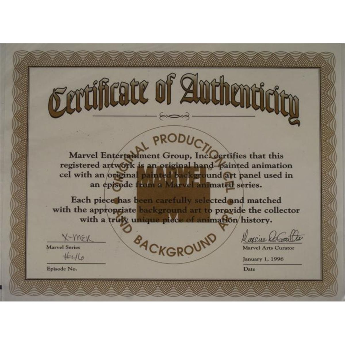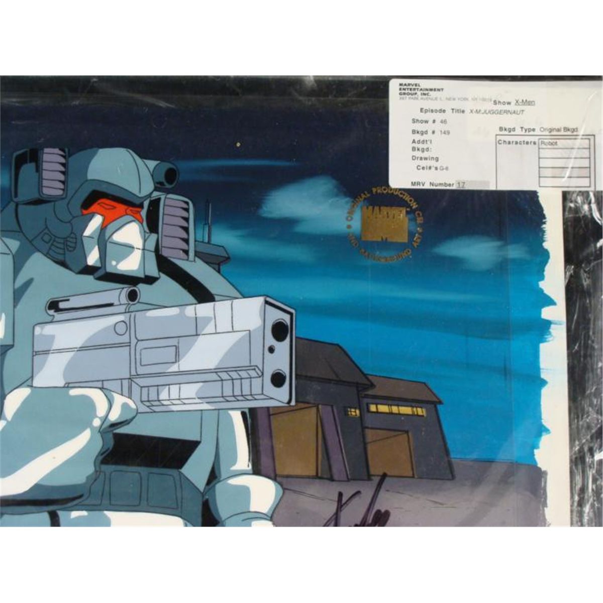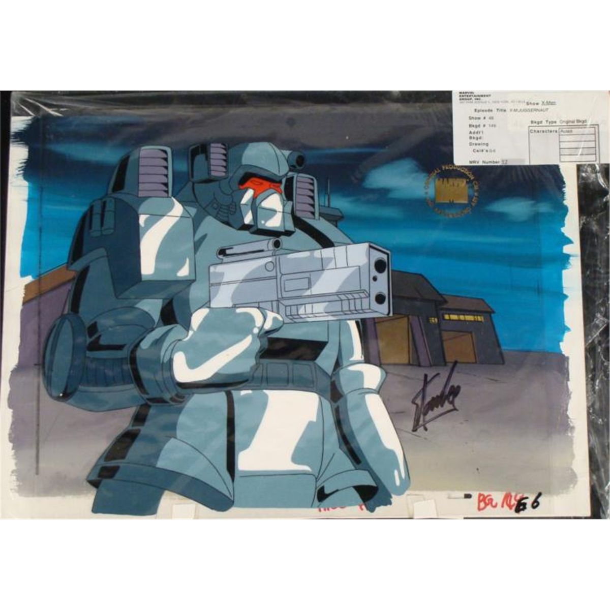 This is an original signed production cel and background from the hit series X-Men. Stan Lee signature is located on the right of cel in black sharpie. * Under a cloud of increasing anti-mutant sentiment, Professor Xavier creates a haven at his Westchester mansion to train young mutants to use their powers for the benefit of humanity, and to prove mutants can be heroes. Xavier recruited Cyclops, Iceman, Angel, Beast and Jean Grey calling them "X-Men" because they possessed the "x-gene", an ability normal humans lacked. Early issues introduced the team's arch enemy, Magneto and his Brotherhood of Evil Mutants, who would later battle the X-Men for years. * Seek and DESTROY!!! * * Original Animated Cel Overall Size of the Cel: 10 1/2" x 12 1/2" Overall Size of the background: 10 1/4" x 14 1/4" Excellent Condition This is an original hand-painted cel set-up used in the production of an episode of X-Men titled "Juggernaut." Each one-of-a-kind set-up represents a slight change in position of the characters. When individually photographed and projected in rapid succession, the images appear to move. * To create production cels, the original animator's drawing is transferred onto an acetate cel (by hand-inking and/or photo copying). The cel is then hand-painted on the reverse side. The background accompanying this set-up is an original production background. * The cel and original background is ready to be matted and framed. The animators notations are located at the bottom of the cel and background. A certificate of Authenticity from Marvel is on the back of background. The Marvel Seal is located at the top right of the cel. The cel and background are in a protective sleeve An information card about the episode is located at the top right of the protective sleeve. *