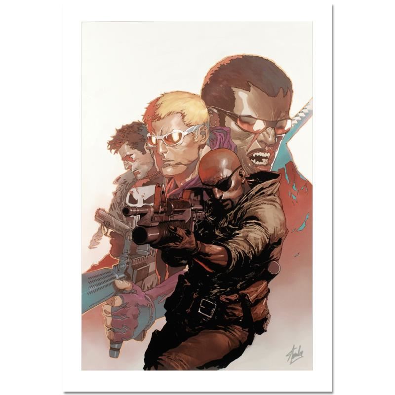 "Ultimate Avengers Vs. New Ultimates #4" is a limited edition giclee on canvas with art by Leinil Francis Yu. Officially licensed by Marvel, this piece is numbered 1/10 and hand signed by creative legend Stan Lee (1922-2018). The piece comes with a certificate of authenticity. Measures approximately 27" x 18".