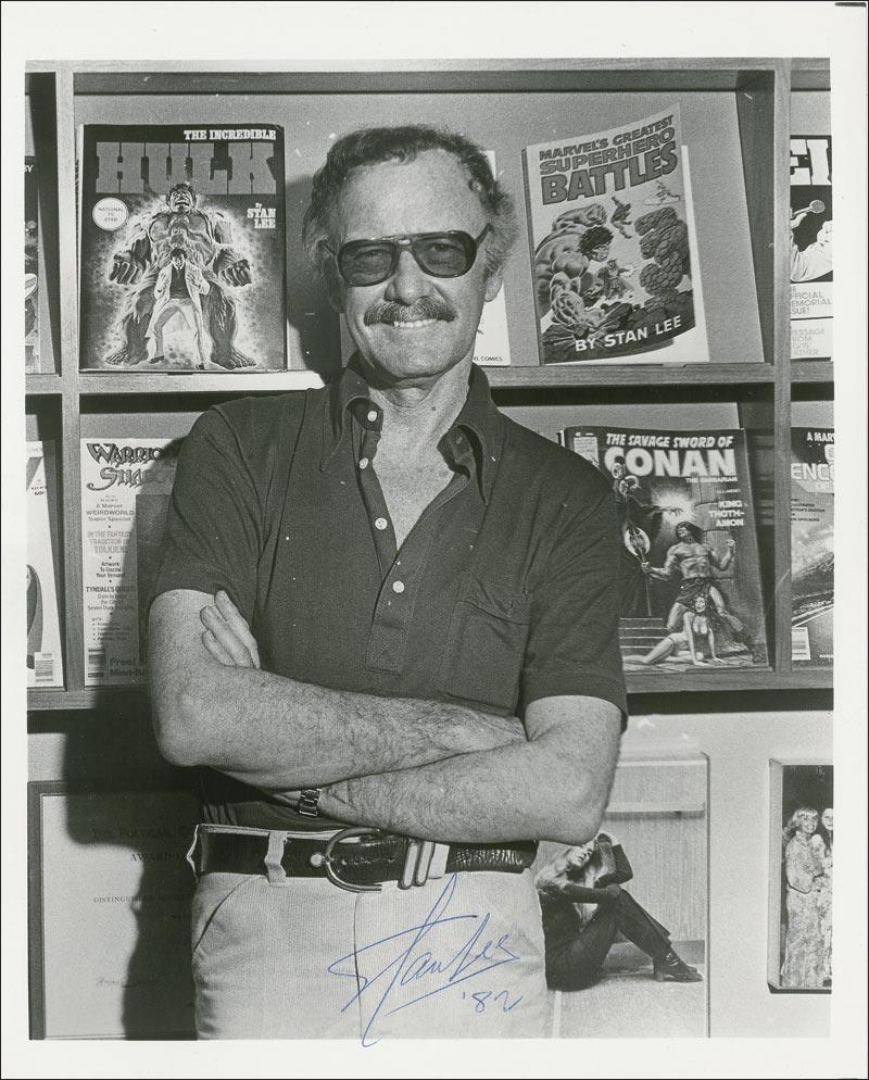 Glossy 8 x 10 photo of Lee posing in front of a bookcase holding some of his works, signed in blue ballpoint, “Stan Lee ‘82.” In fine condition, with a few scattered creases and surface impressions from collector’s notations on reverse.