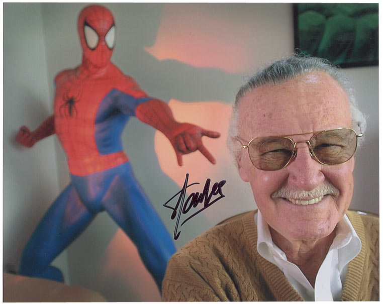 Color glossy 10 x 8 photo of an elated Lee in front of a life-size Spider Man figure, signed in black felt tip. In fine condition.