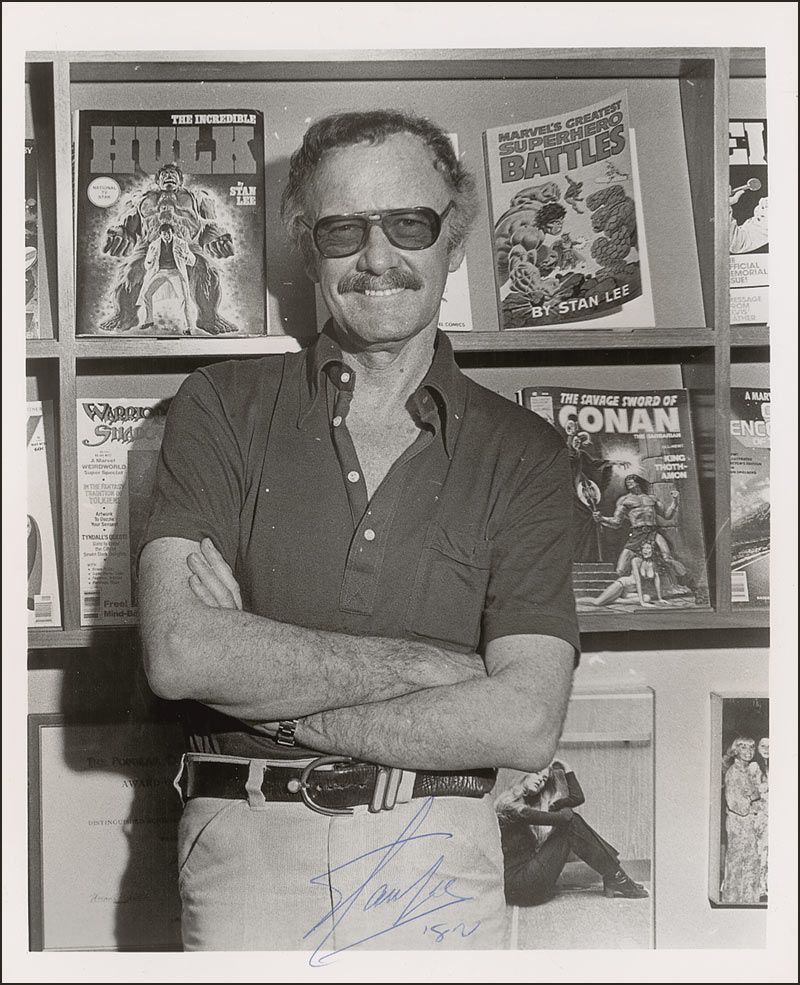 Glossy 8 x 10 photo of Lee leaning against a bookcase of his works, signed in blue ballpoint, “Stan Lee ‘82.” In fine condition, with a paperclip impression to top edge.