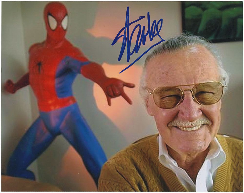Color glossy 10 x 8 photo of Lee with Spiderman in the background, signed in-person in blue felt tip. In fine condition. Originally obtained by in-person specialist Mike Wehrmann.