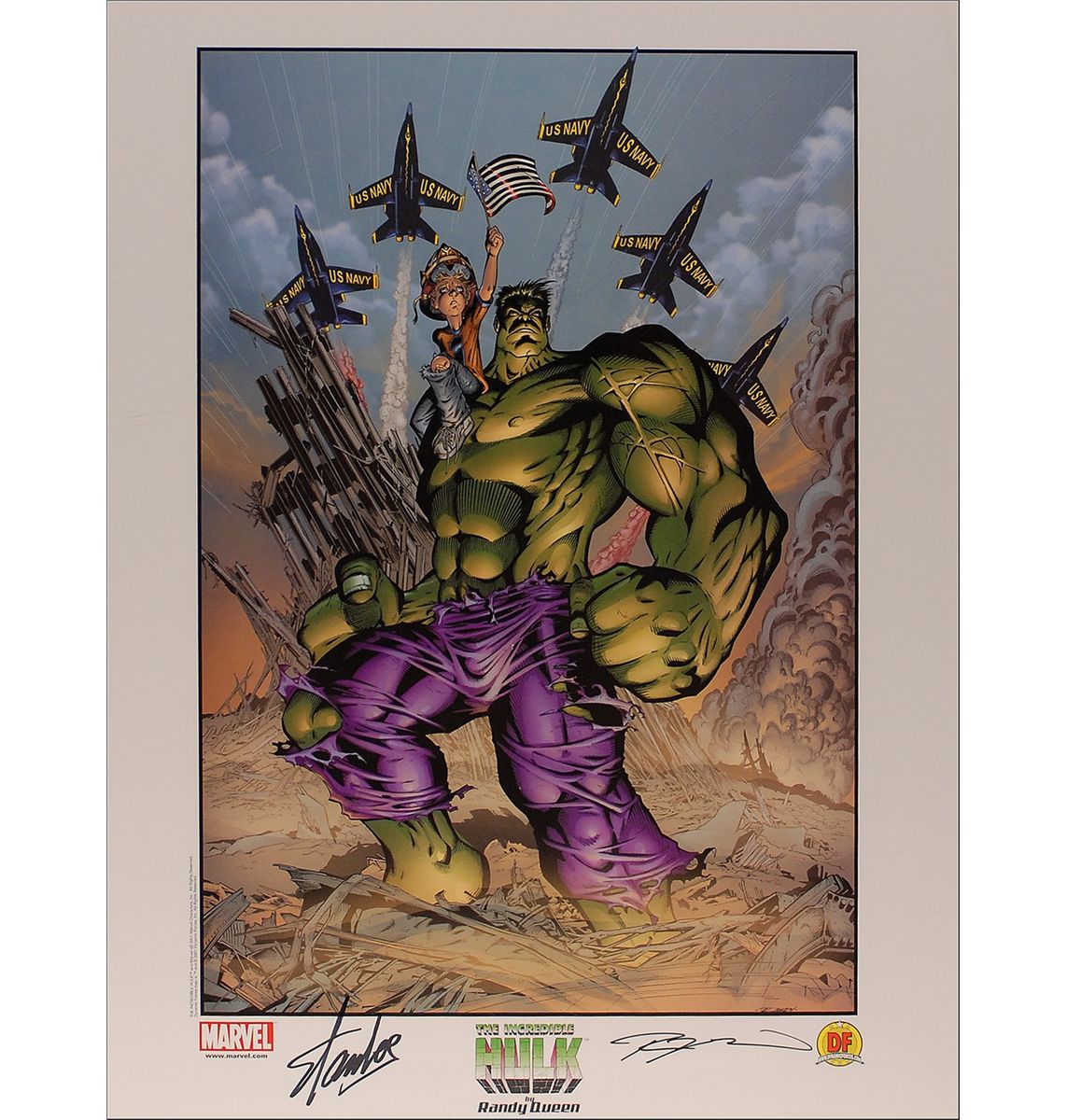Patriotic color 18 x 24 print of the Incredible Hulk, signed in black felt tip by Stan Lee and Randy Queen. Rolled and in fine condition, with a couple light edge dings.