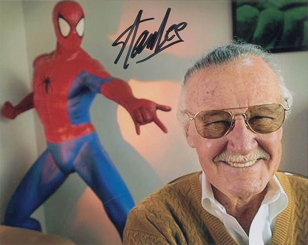 Color satin-finish 10 x 8 photo of Lee in front of a Spider-Man statue, signed in-person in black felt tip. In very fine condition, with a slightly grainy quality to the image.