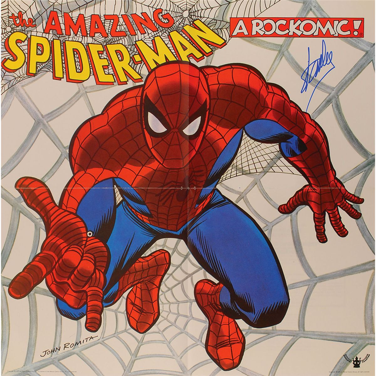 Color 22.5 x 22.5 poster entitled The Amazing Spiderman: A Rockomic!, signed in blue felt tip. In fine condition, with central vertical and horizontal folds, and two central tack holes.