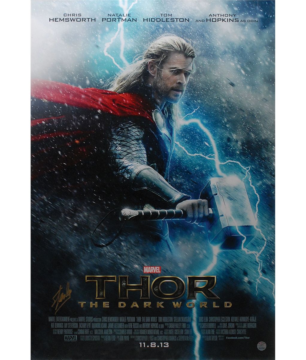 Color 27 x 40 one-sheet movie poster for Thor: The Dark World, signed in gold ink by Lee. Rolled and in fine condition, with an Excelsior Approved hologram affixed to lower right corner.