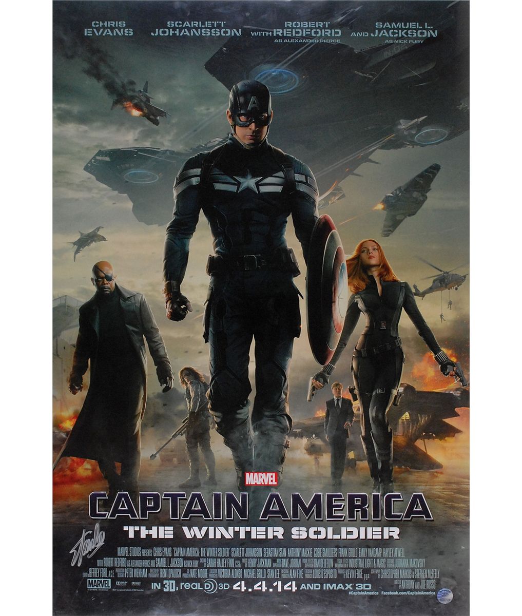 Color 27 x 40 one-sheet movie poster for Captain America: The Winter Soldier, signed in silver ink. Rolled and in fine condition, with some scattered edge creases and dings, and an Excelsior Approved hologram affixed to lower right corner.