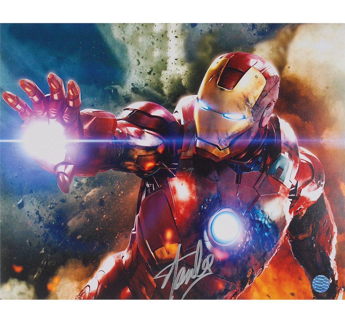 Color satin-finish 20 x 16 photo of the Iron Man, prominently signed at the bottom in silver ink. In fine condition, with a Stan Lee authentication label affixed to the lower right.