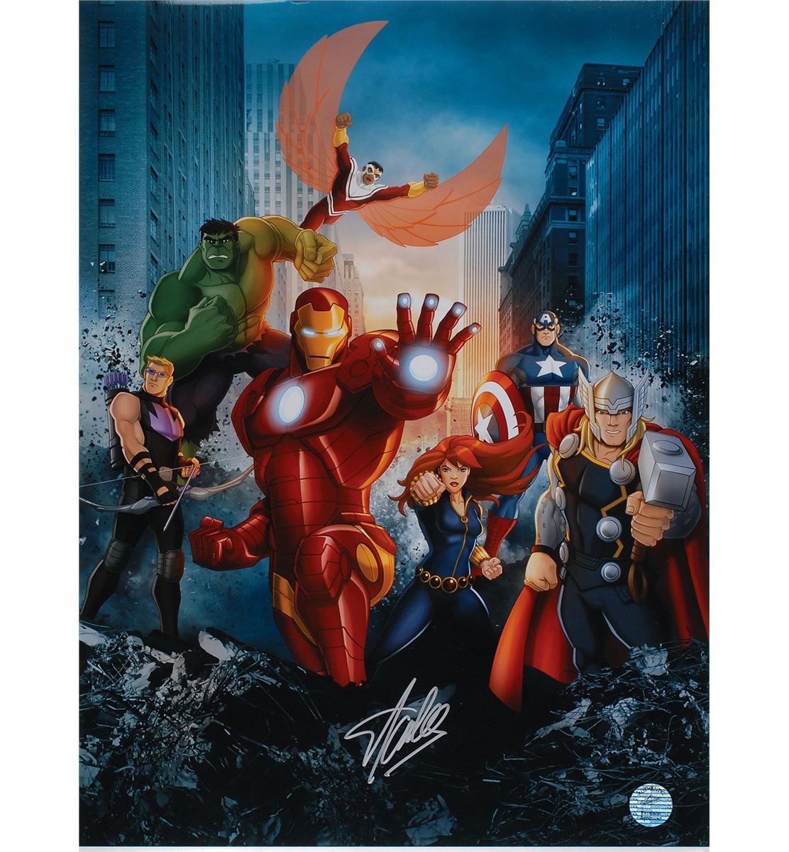 Color glossy 14.75 x 20 photo of the Avengers, signed in silver ink. In fine condition, with a Stan Lee authenticity label affixed to the lower right corner, and an evenly trimmed right edge.