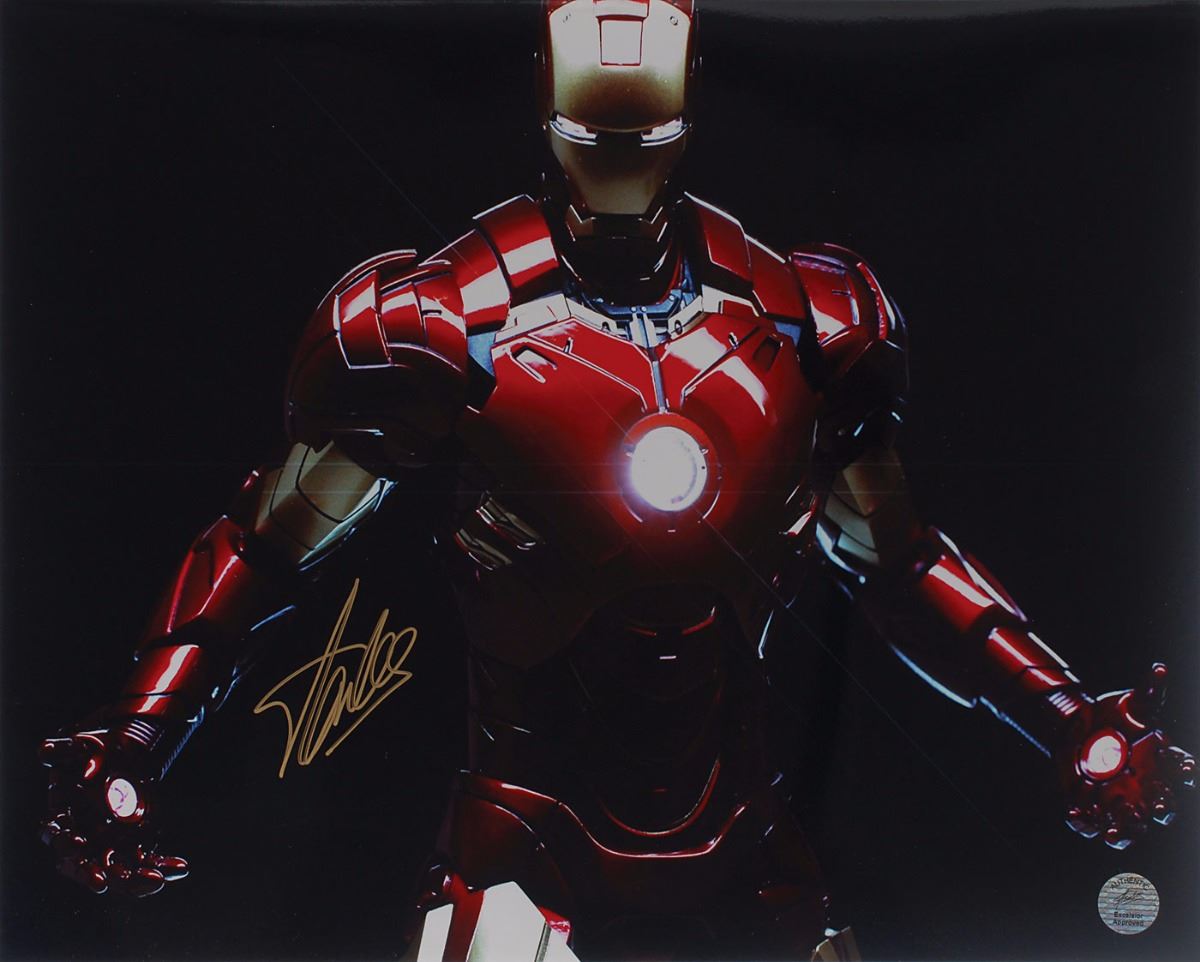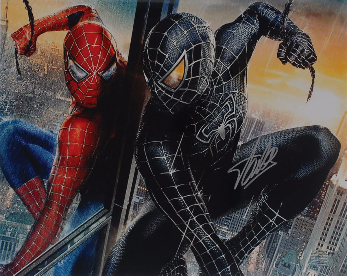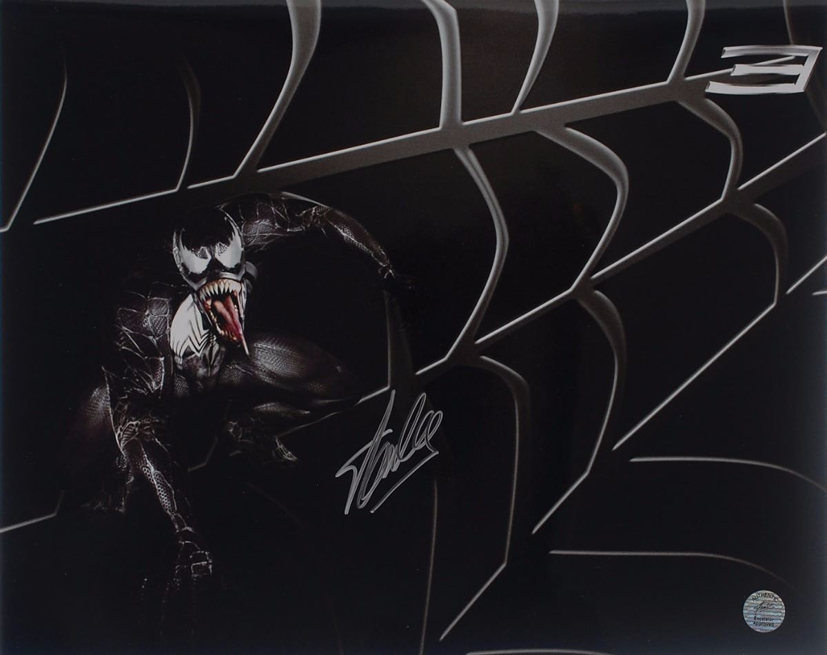 Three color glossy 20 x 16 photos from the Marvel universe, two from Spider-Man 3—one depicting Venom and the other showing Spidey staring at his black-colored doppelganger—and the third showing Iron Man with his arms extended, each signed in silver or gold ink by Lee. In overall fine condition, with Stan Lee authenticity labels affixed to the lower right corner of each.
