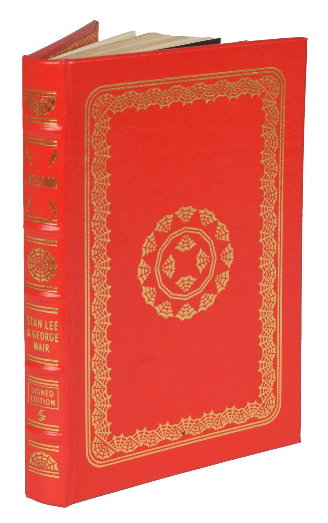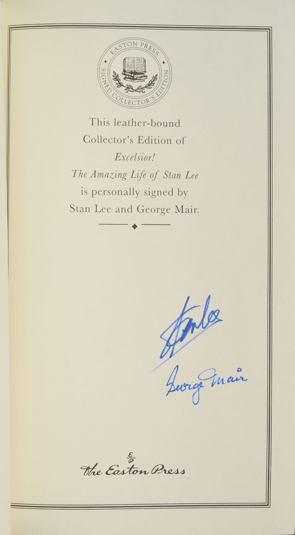 Signed book: Excelsior! The Amazing Life of Stan Lee. Collector's edition. Norwalk, CT: The Easton Press, 2009. Leather-bound hardcover, 6.5 x 9.5, 246 pages. Signed on the colophon in blue felt tip by Lee, and by the co-author George Mair. In fine condition.