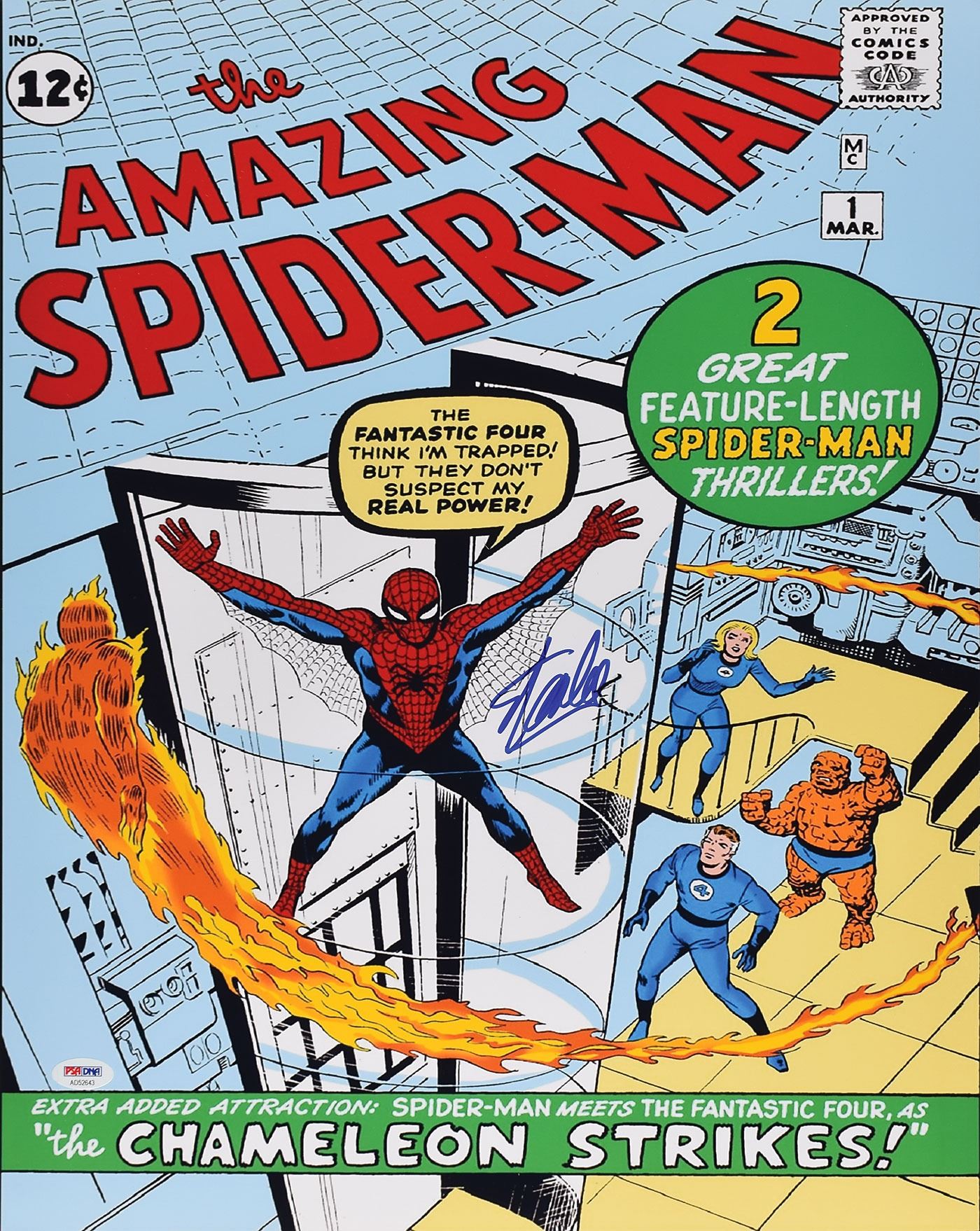 Color satin-finish 16 x 20 photo of the cover to issue No. 1 of The Amazing Spider-Man comic book, signed in blue felt tip by Stan Lee. In fine condition, with a PSA/DNA label affixed to lower left corner. Accompanied by a certificate of authenticity from PSA/DNA.