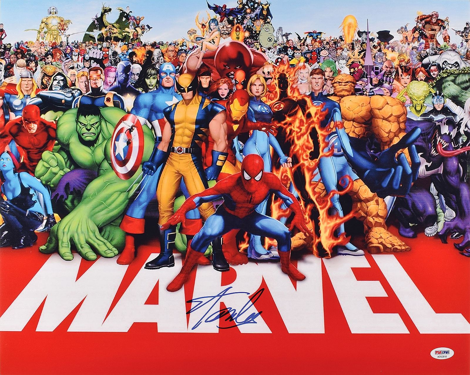 Color satin-finish 20 x 16 photo of numerous heroes and villains from the Marvel universe, signed in blue felt tip by Stan Lee. In fine condition, with slight grainy quality to image and a PSA/DNA label affixed to lower right corner. Accompanied by a certificate of authenticity from PSA/DNA.