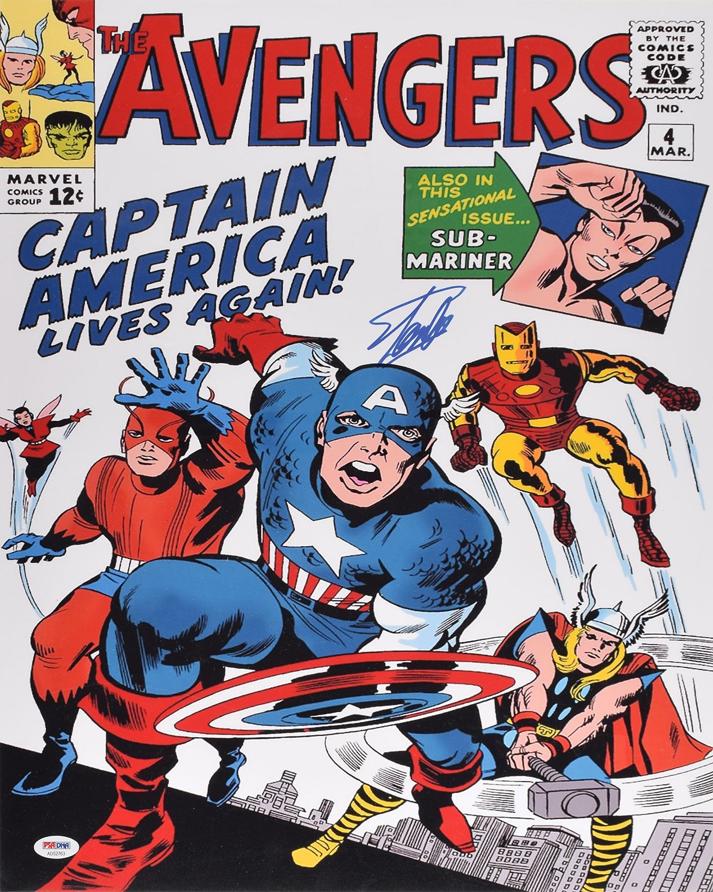 Color satin-finish 16 x 20 photo of the iconic cover to issue No. 4 of The Avengers comic book, signed in blue felt tip by Stan Lee. In fine condition, with a PSA/DNA label affixed to lower left corner. Accompanied by a certificate of authenticity from PSA/DNA.