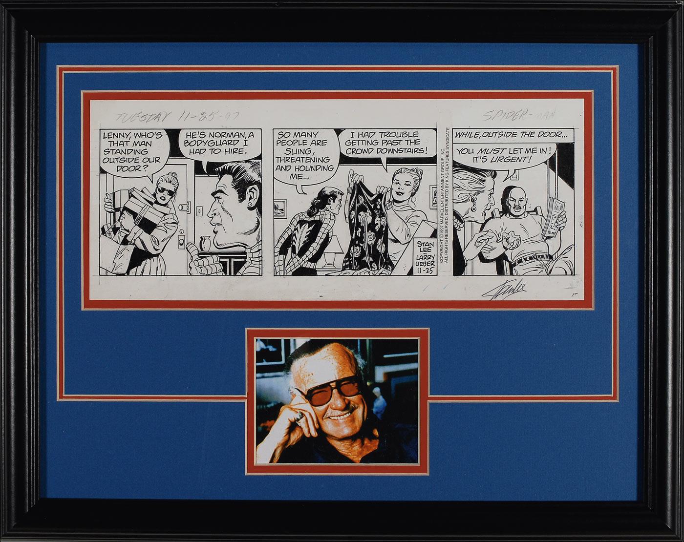 Original three-panel Spider-Man daily comic strip, dated November 25, 1997, on a 13.5 x 5.5 off-white sheet of artist’s cardstock. This strip depicts another “average” day in Spider-Man’s life. Signed in black ballpoint beneath the last panel, “Stan Lee.” Double matted with a small color photo of Lee to an overall size of 19 x 15. In fine condition, with light soiling and usual production notations.