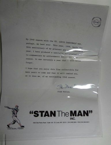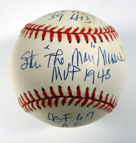 Rawlings Official Ball National League signed by 'Stan "The Man" Musial MVP 1948 HOF 69 #6 376 AVG. 39 Hr's 47/475' in blue ink. COA Est. Value $125.00 - $145.00.