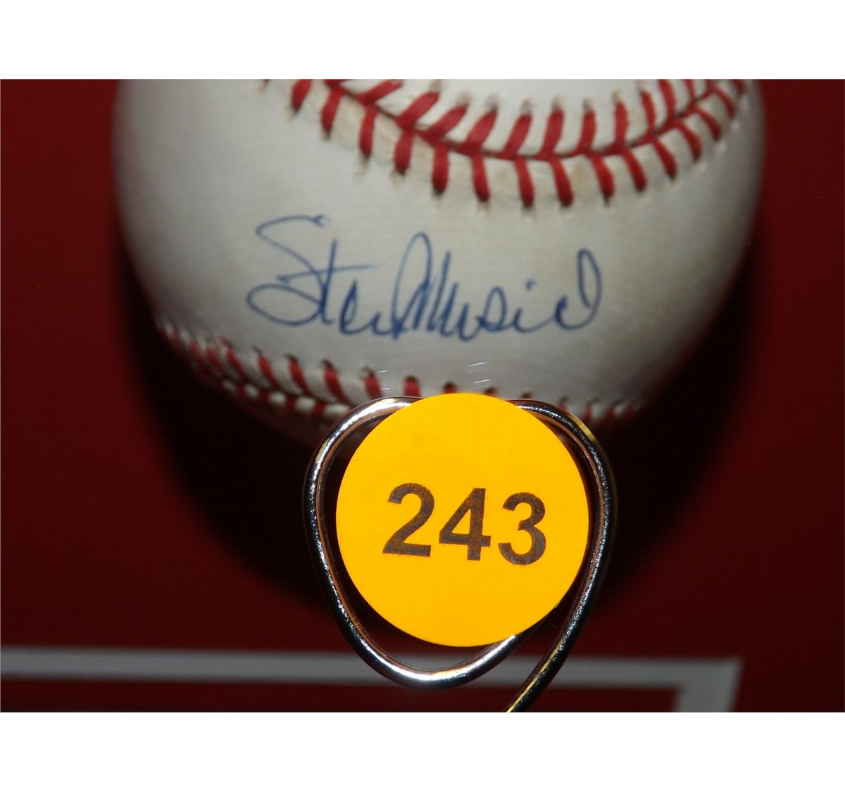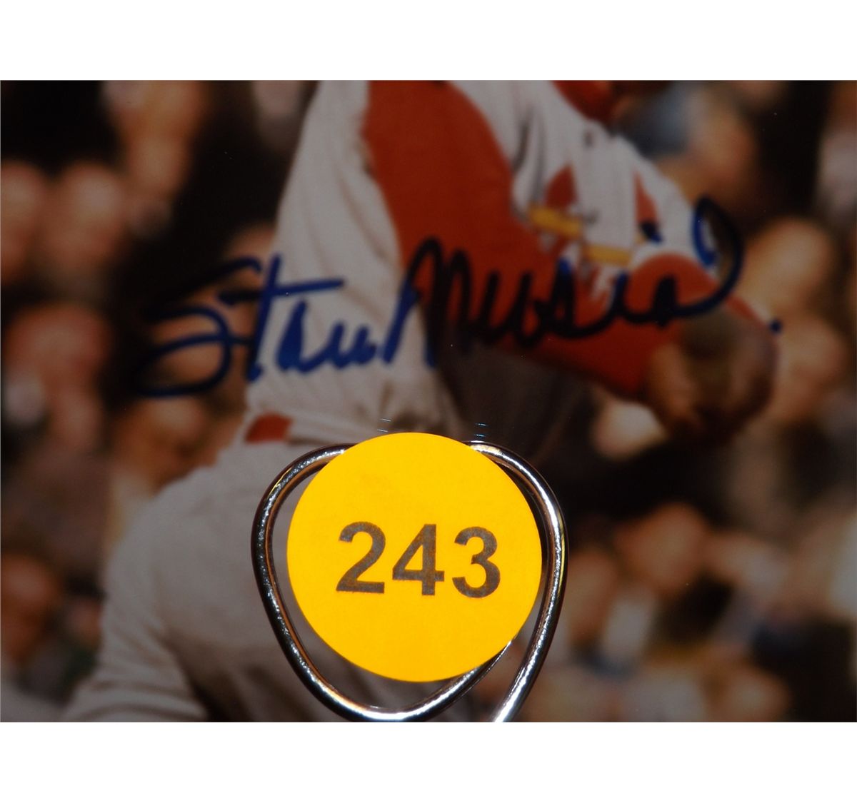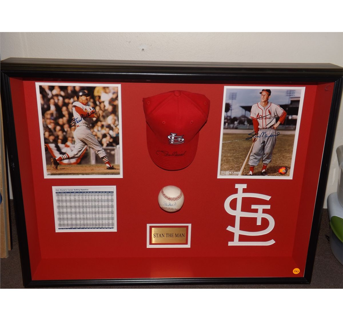 Stan Musial Autographed Shadowbox Display. 31x23x5 including hat, ball and two photos (All Autograp