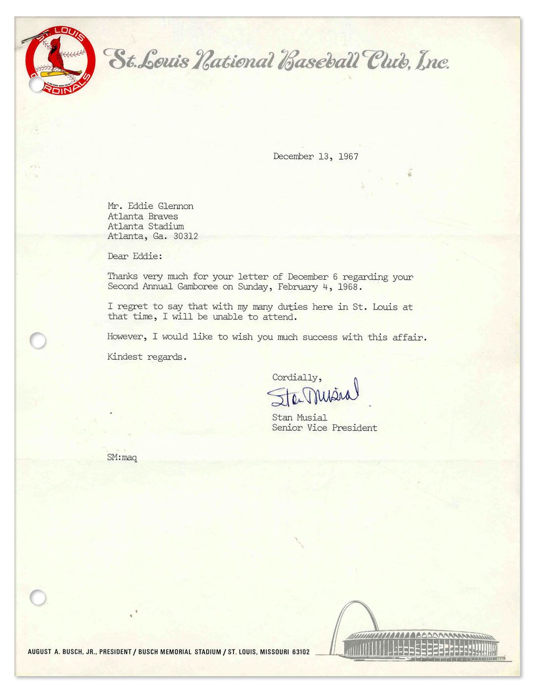 Stan Musial typed letter signed on St. Louis Cardinals letterhead, dated 13 December 1967. Musial declines an invitation from Eddie Glennon of the Atlanta Braves to attend a ''Gamboree.'' Letter measures 8.5'' x 11''. Mailing folds, staple to upper left and three punch holes to left margin, otherwise near fine condition.