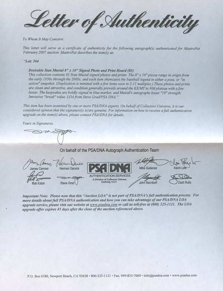 Hand-signed in blue felt-tip pen by Stan Musial (Cardinals HOF). Autograph includes an official PSA/DNA Auction House LOA for authenticity purposes.