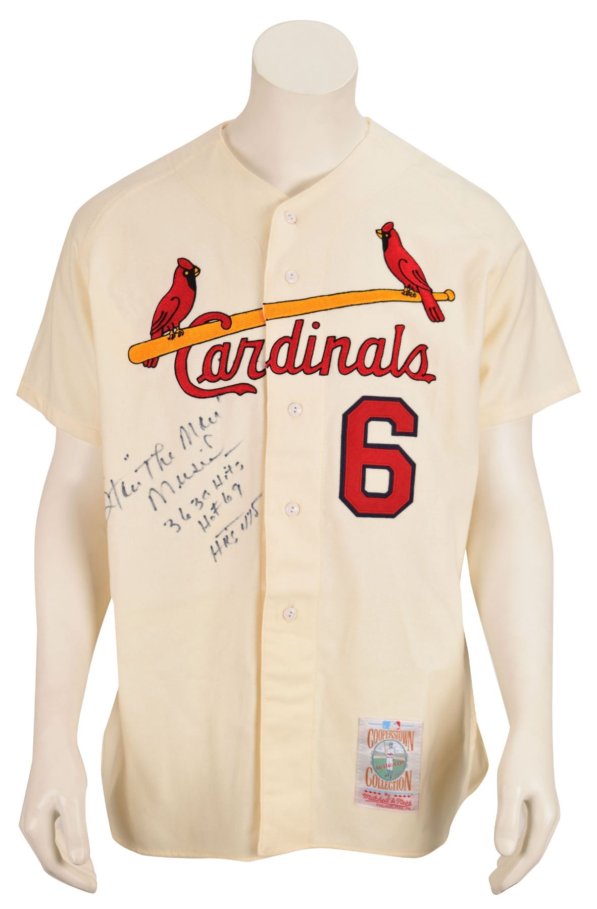 Official Mitchell & Ness Cooperstown Collection St. Louis Cardinals baseball jersey, with sewn on letters and numbers, beautifully signed in black felt tip on the front, "Stan 'The Man' Musial, 3630 Hits, HOF 69, HRs 475." In fine condition. A gorgeous, classic jersey boasting a huge signature from the legendary Cardinal.