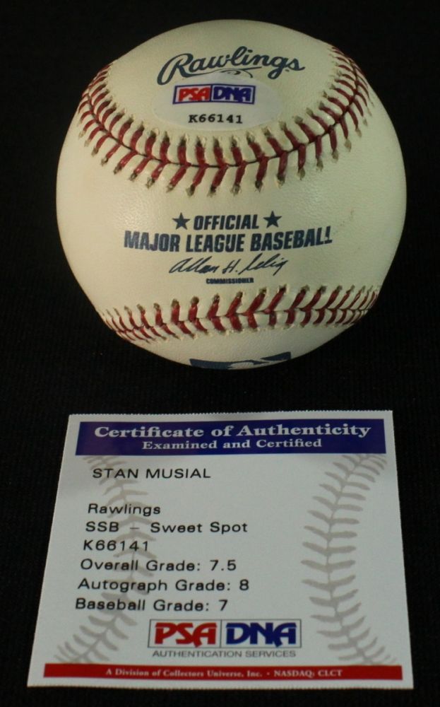 Official Major League Baseball hand-signed and inscribed in blue ink by Stan Musial (Cardinals HOF). The baseball comes with an official PSA/DNA COA for authenticity purposes.