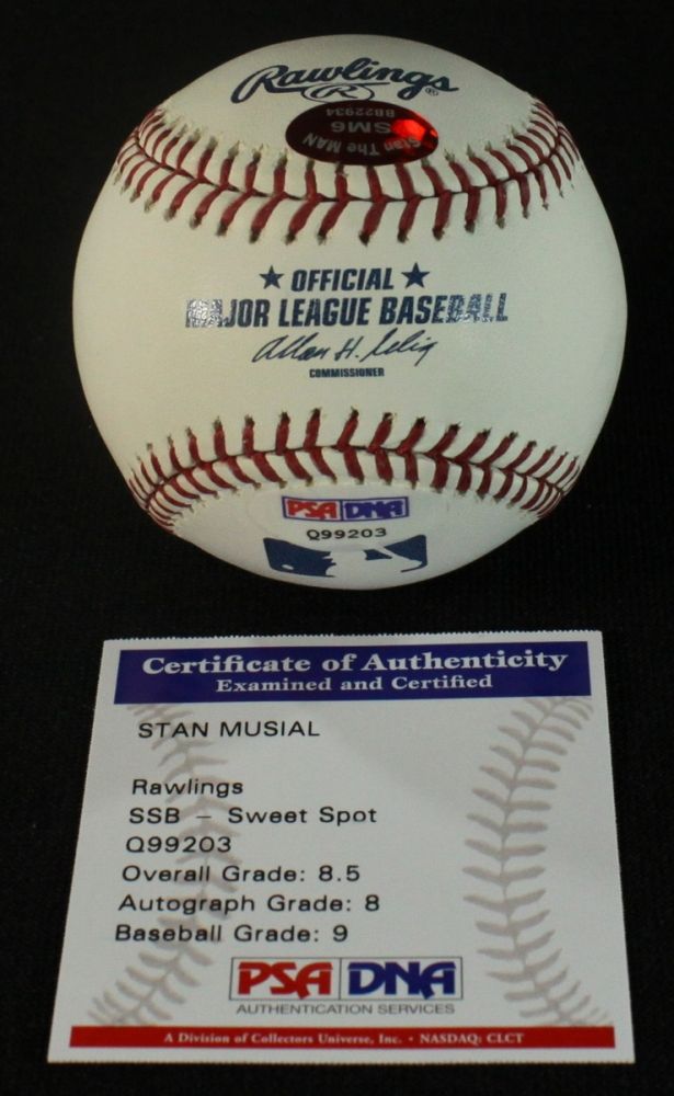 Official Major League Baseball. Hand-signed and inscribed in blue ink by Stan Musial (Cardinals HOF). The baseball has been graded "8.5" by PSA. The autograph includes PSA/DNA hologram and matching COA for authenticity purposes. Autograph also contains an official Stan Musial Hologram for authenticity purposes.