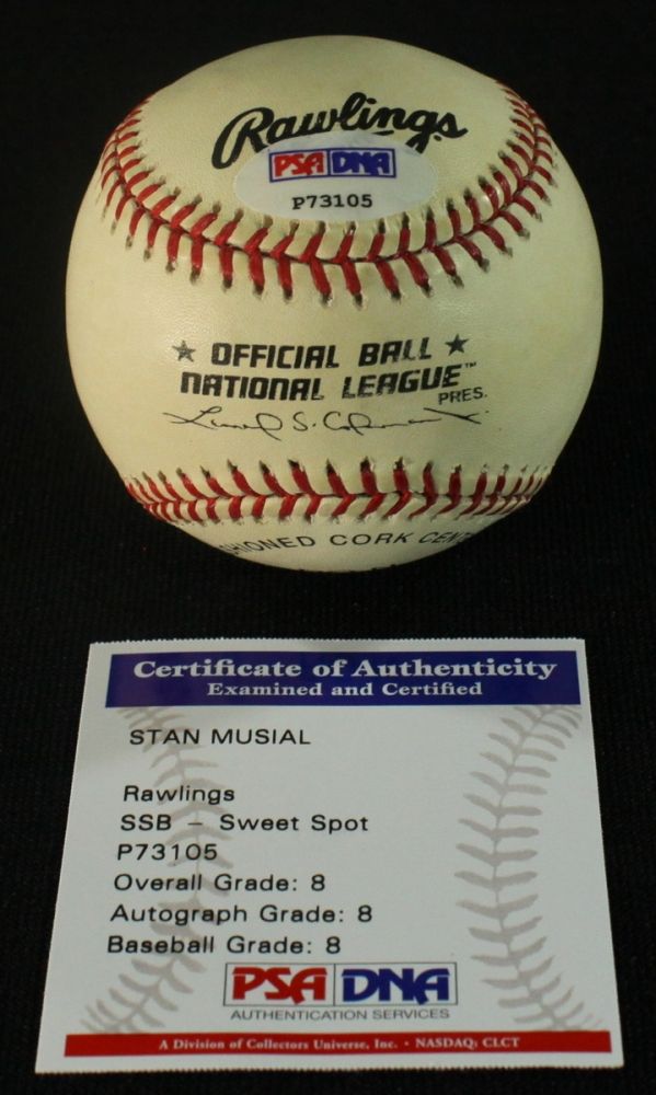 Official National League Baseball hand-signed in blue ink by Stan Musial (Cardinals HOF). The baseball comes with an official PSA/DNA COA for authenticity purposes.