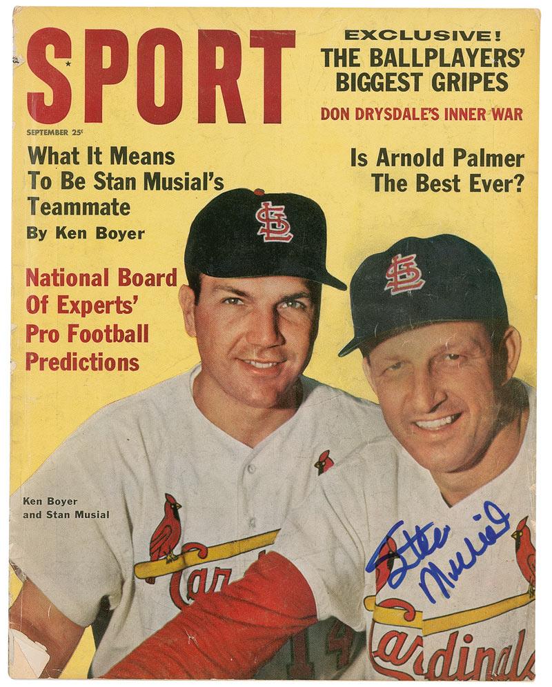 Sport magazine from September 1962, 8.5 x 11, signed on the front cover in blue felt tip by Musial. Partial separation of front cover, as well as scattered creases and soiling, toning and edge tears to inside pages, and scattered soiling to covers, otherwise very good condition.