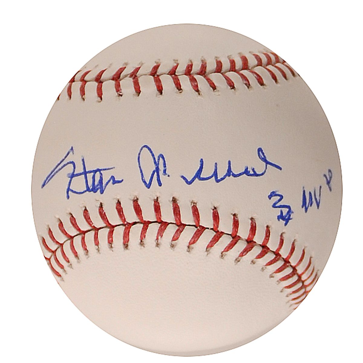 Official Rawlings Major League baseball signed in blue ballpoint on the sweet spot, “Stan Musial 3x MVP.” In very fine condition, with PSA/DNA and Stan the Man authentication labels affixed to rear side panels. Accompanied by a certificate of authenticity from PSA/DNA, which gives the ball an overall grade of 8.5.
