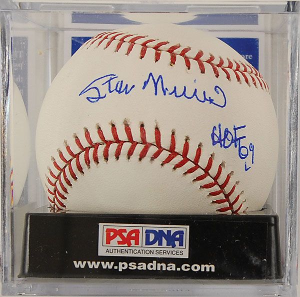 Official Rawlings Major League baseball signed in blue ballpoint on the sweet spot, “Stan Musial, HOF 69.” Graded a ‘9’ overall by PSA/DNA and encased in a ball cube with a PSA/DNA certificate of authenticity. In fine condition.