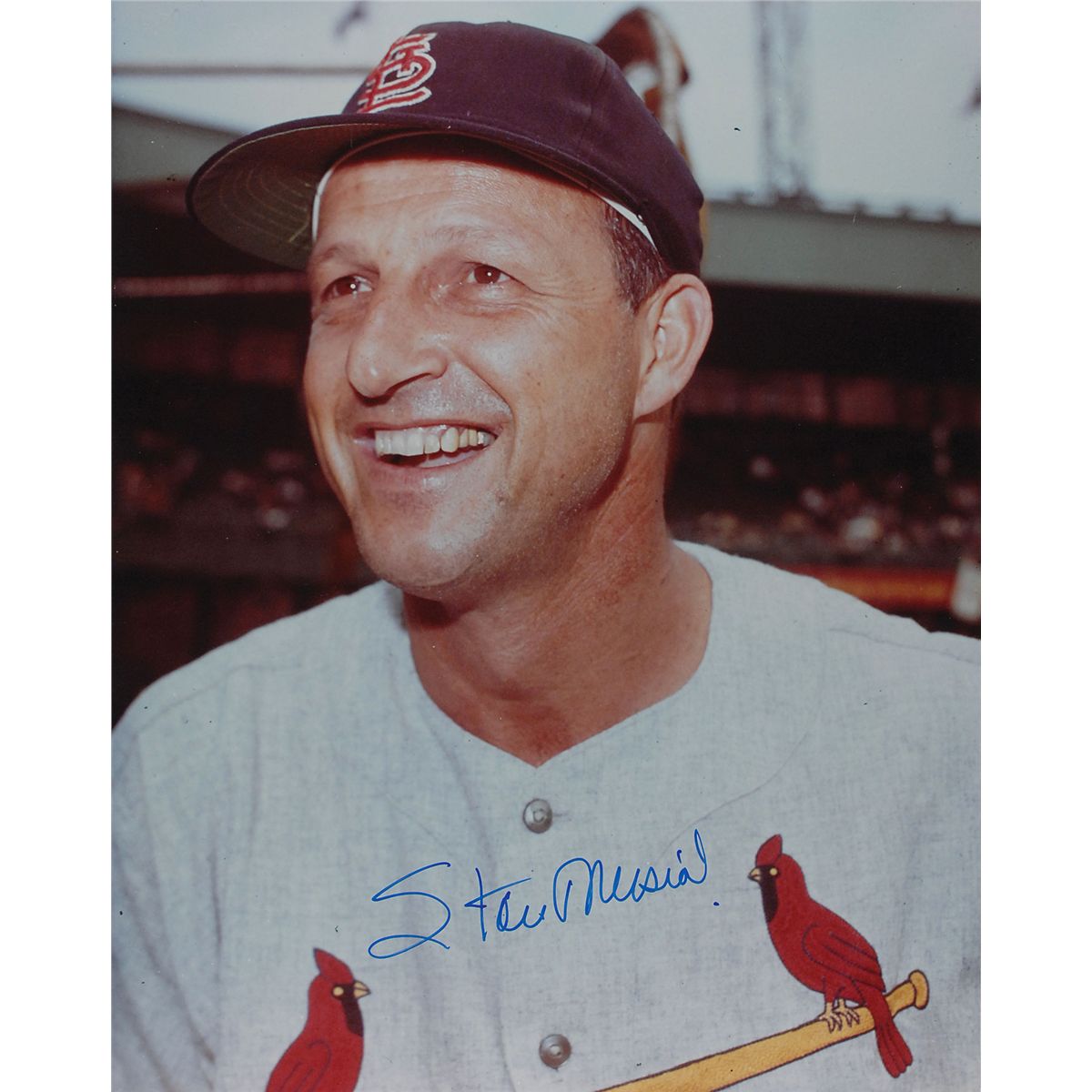 Color satin-finish 16 x 20 head-and-shoulders photo of Musial in his Cardinals uniform, signed in blue felt tip. In fine condition.