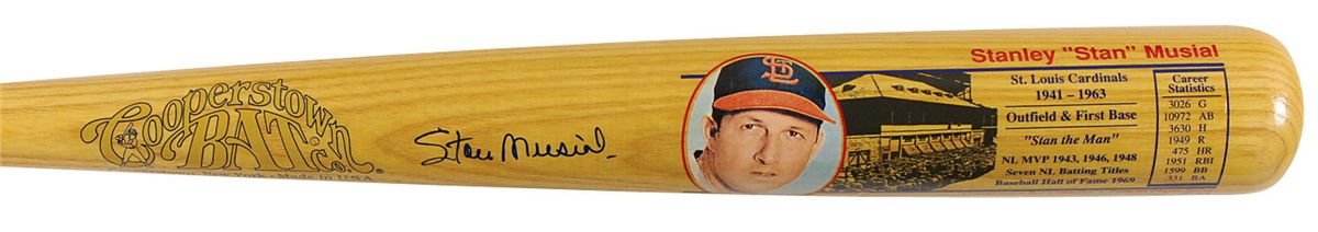 Official Cooperstown Bat Co. Musial Hall of Fame commemorative baseball bat signed in blue felt tip on the barrel. In very fine condition.