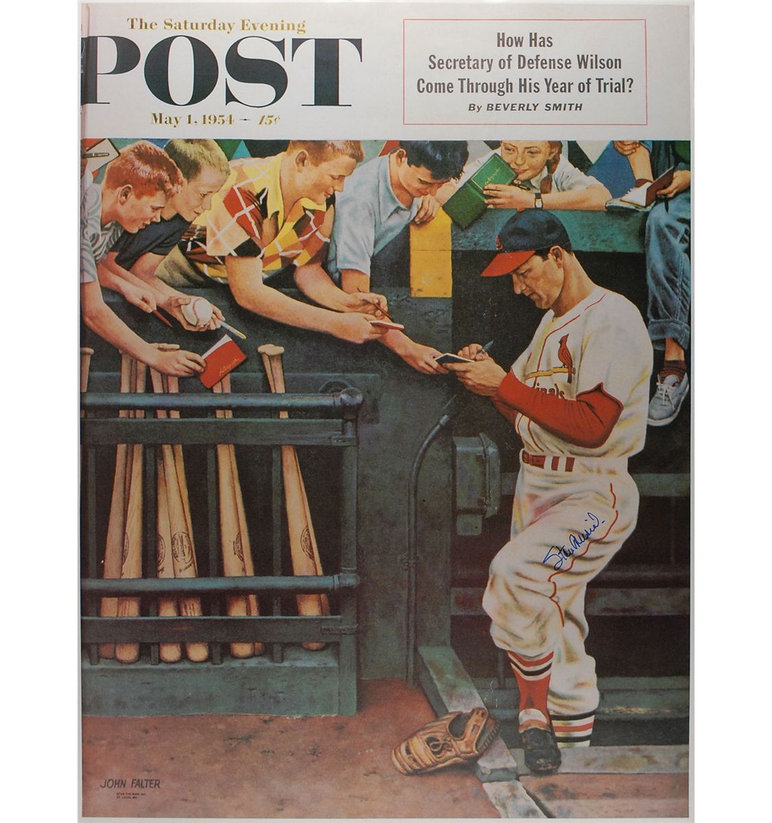 Color 30 x 40 print of the front cover of the May 1, 1954, Saturday Evening Post, featuring Musial signing autographs for young fans, signed in blue felt tip. In fine condition, with some scattered light creases.